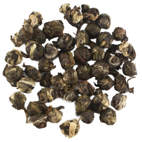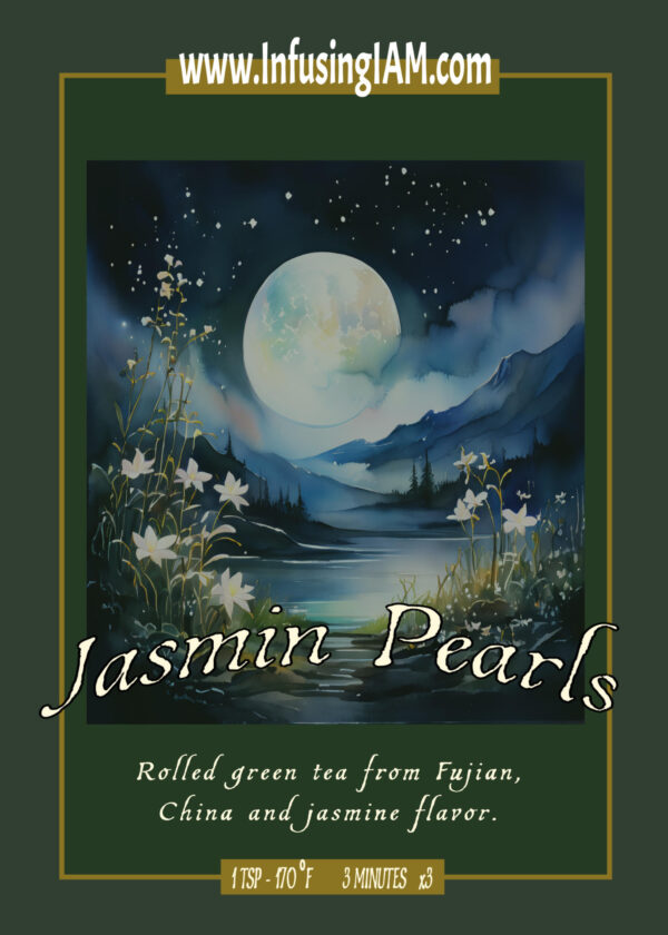 Learn More:Jasmine pearls, also known as Jasmine Dragon Pearls, are a type of green tea that originated in the Fujian Province of China. Traditional jasmine tea is made from fresh Pouchong leaves picked in early spring, which are stored until late summer when fresh jasmine flowers bloom. The tea is hand-rolled into pearls. The resulting flavor of jasmine tea is subtly sweet, highly fragrant, and perfect for multiple infusions. Be cautious of cheap imitations! Many grades of Jasmine Pearls feature lower-quality tea and craftsmanship. These may appear dull, somewhat rough, and less tightly rolled. While they are less expensive, the difference in taste is noticeable. At Infusing I AM, we take pride in hand-blending many of our teas, carefully calculating our blends, and selecting only the finest teas and ingredients for our collection.